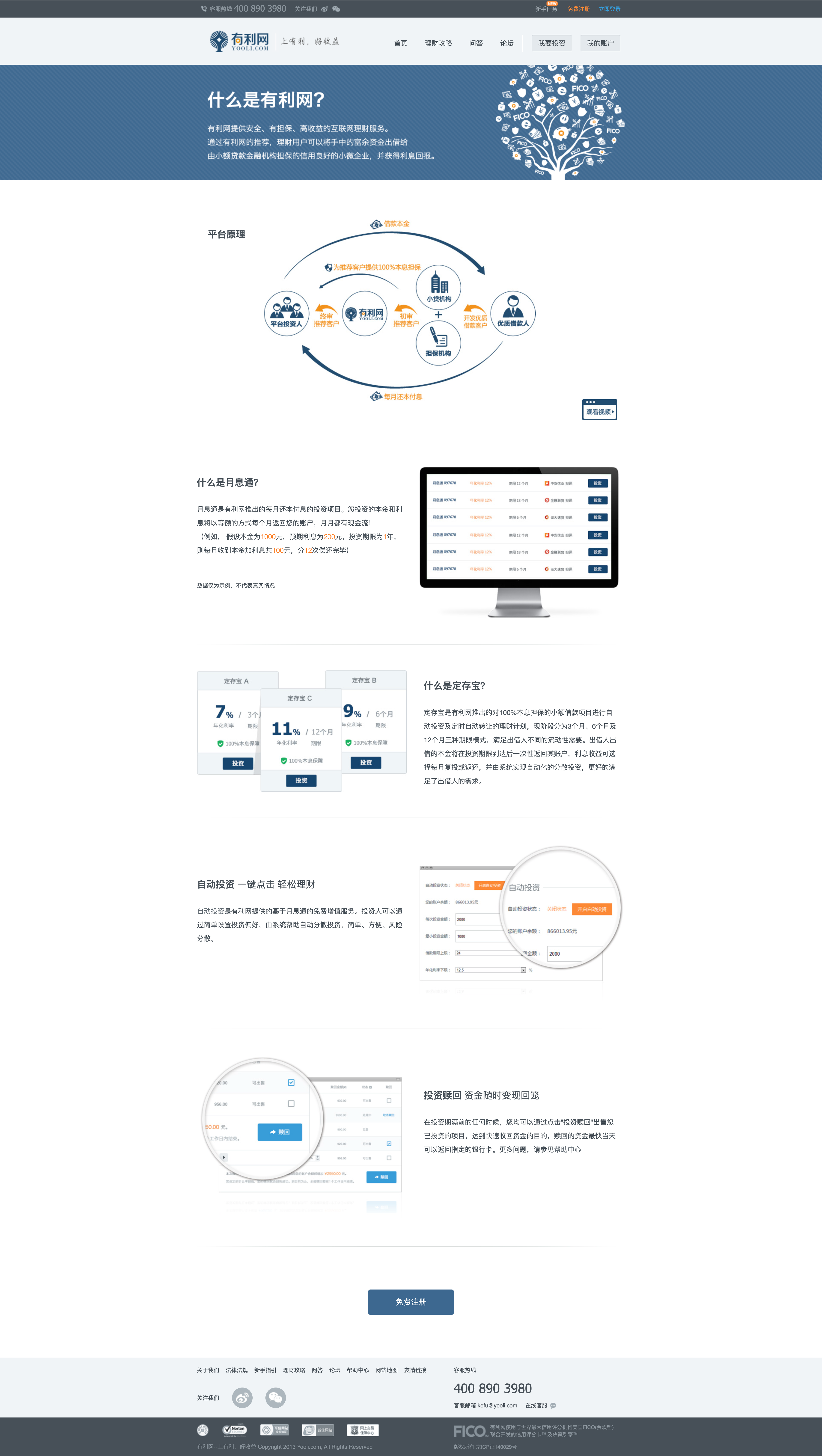 - 平台首页中以图文形式大幅宣传“100%本息担保”“FICO+机构全额担保”“省心省力”等承诺性话语;